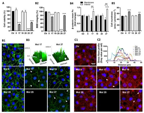 Overall, molecules 17, 25, and 27 were cytotoxic for HBMEC, while molecules 8, 19, and 20 were safe for direct drug delivery, thus proceeding to further assays of BBB transport.