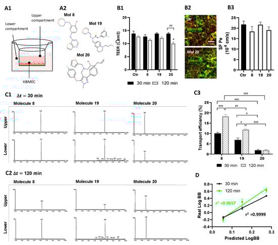 Analysis of endothelial transport efficiency showed that molecules 8 and 19 are transported across the HBMEC monolayer in a time-dependent manner (p < 0.001, molecule 8; p < 0.05, molecule 19, 30 vs. 120 min), while molecule 20 transport did not increase significantly from 30 to 120 min of incubation (Figure 10C3). All molecules proved a higher-off range transport relatively to well-known BBB permeable compounds.