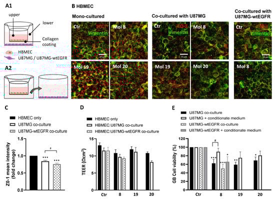 A reliable co-culture system corroborated candidate molecules as BBB permeable and strong anti-GB agents: (A) HBMEC were grown to confluence in Transwell inserts and U87MG or U87MG-wtEGFR cells were seeded in the lower chamber. After 3 days of co-culture, supernatant in the upper chamber was replaced with fresh medium (control) or with medium supplemented with molecules 8, 19, or 20 at EC50. After 2 h, the inserts were removed and tested for barrier integrity (B–D), whereas the gliomasphere-like cells were maintained in culture for more than 24 h to assess cell viability by MTT assay (E). In parallel, the U87MG or U87MG-wtEGFR cells were incubated for 24 h with the basolateral conditioned medium of HBMEC after incubation with the molecules. (A1) Schematic representation of the BBB-GB co-culture model and (A2) of the conditioned medium assay. (B) Immunostaining for ZO-1 and vimentin in HBMEC mono-culture or co-cultured with U87MG or U87MG-wtEGFR. Images are representative of three independent experiments each with 10 random fields analyzed. (C) Semi-quantitative analysis of ZO-1 expression in HBMEC cells mono-cultured vs. co-cultured with U87MG or U87MG-wtEGFR by mean fluorescence intensity fold-change. (D) TEER of HBMEC after 2 h of incubation with the molecules both in mono- or co-culture system. (E) U87MG or U87MG-wtEGFR cell viability assessment by MTT assay after molecules exposure either in co-culture system or by conditioned medium. Data presented in (C,E) are means ± SEM of three independent experiments each with 10 random fields analyzed. Values in (D) are means ± SEM of three independent experiments. Statistical analysis was performed by one-way ANOVA with Tukey correction. * p < 0.05, ** p < 0.01, *** p < 0.001; # p < 0.05 between indicated groups.