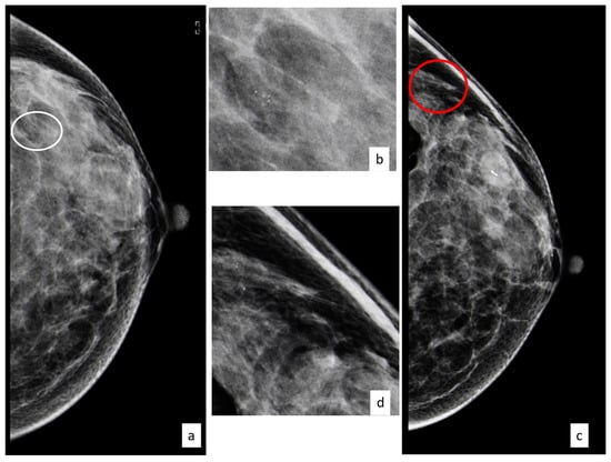 Forty-nine-year-old patient with a cluster of microcalcifications at the upper outer quadrant of the left breast ((a) CC left view, with the white circle showing microcalcifications; (b) magnifications); the woman underwent vacuum-assisted excision and after three years developed a new cluster of microcalcifications ((c) CC left view, with the red circle showing microcalcifications; (d) magnifications) that, after biopsy, turned out to be ductal carcinoma in situ.