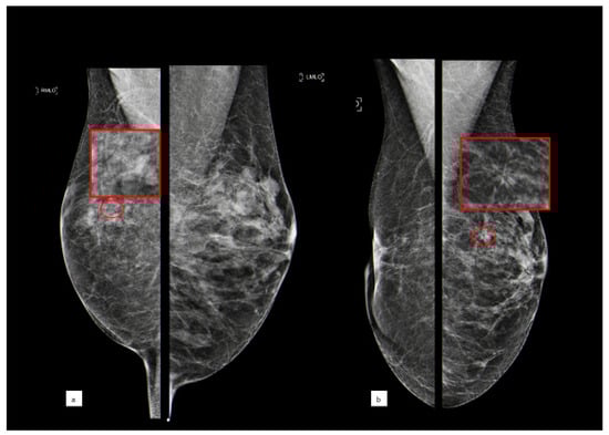 A 56-year-old patient with a cluster of microcalcifications at the upper outer quadrant of the right breast that was diagnosed as ADH after biopsy ((a) MLO bilateral view, with the red circle showing microcalcifications corresponding to a B3 lesion; the red square shows a magnification of this area); the woman underwent surgical excision and after five years developed an architectural distortion in the contralateral breast ((b) MLO bilateral view, with the red circle showing distortion; the red square shows a magnification of this area) that, after biopsy, turned out to be invasive ductal carcinoma.