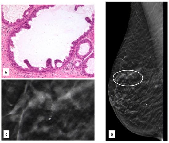 Histologic picture (a, Magnification (×20)) and radiological presentation ((b) right MLO view; (c) magnification) of atypical ductal hyperplasia (white circle).