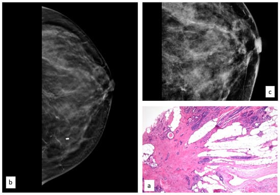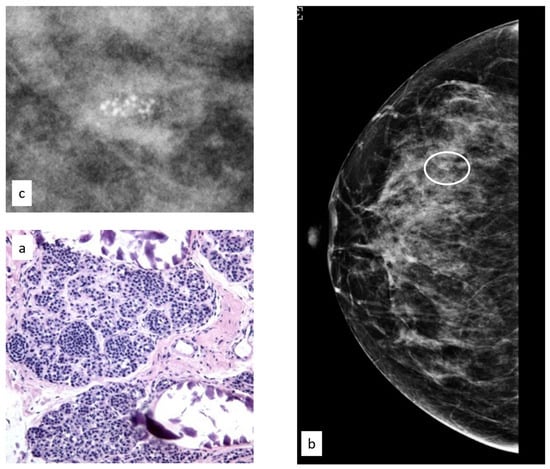 Histologic picture (a, Magnification (×20)) and radiological presentation ((b) right CC view; (c) magnification) of lobular intraepithelial neoplasia (white circle).