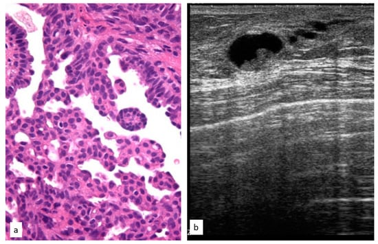 Histologic picture (a, Magnification (×20)) and ultrasound presentation (b) of atypical papillary lesions.