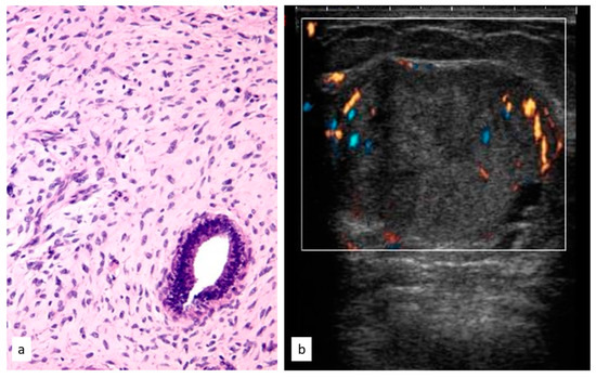 Histologic picture (a, Magnification (×20)) and ultrasound presentation (b) of phyllodes tumors.
