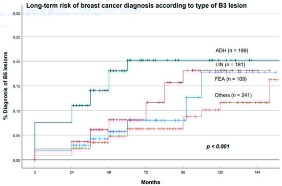 We then performed a Kaplan–Meier estimation of the cumulative long-term risk of breast cancer associated with each type of B3 lesion. ADH was associated with the highest risk of BC diagnosis, followed by LIN and FEA. The differences were statistically significant (p < 0.001; log-rank test), as shown in Figure 9.