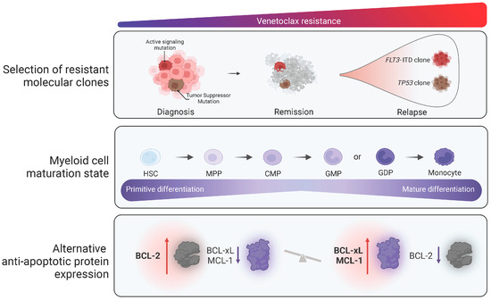 Primary or acquired resistance to VEN or HMA + VEN combination therapy can occur via multiple mechanisms, many of which (including both cell maturation state and molecular aberrations) converge on increased alternative anti-apoptotic proteins, in particular MCL-1 and BCL2L1 [,,]. Indeed, many VEN-resistant AML cell lines can be re-sensitized to VEN by targeting MCL-1 or BCL2L1 [].