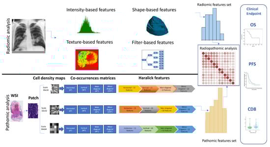 To date, few studies have explored the cross-scale association between radiomics and pathomics features in glioblastoma multiforme (GBM) and lung cancer. Recently, in a study led by Alvarez-Jimenez et al., the authors investigated the radiopathomics association between cellular density and image heterogeneity across radiology and histopathology datasets in lung cancer. This work demonstrated that the spatial patterns of tumor heterogeneity between these two approaches may be similar []. In another study [], the authors determined the association between radiomic features extracted from preoperative ADC maps and post-contrast T1 images and pathomics features arising from H&E digitized pathology images in GBM patients. However, there has been a lack of studies investigating the relationship between radiomics and pathomics features in immunotherapy cohorts. With this premise, this work presents preliminary findings of the radiopathomics association in NSCLC patients treated with immunotherapy. Through this, we can identify pathomics features that may reflect the tissue composition basis of CT radiomics descriptors. Furthermore, we also explored the association of imaging-based features with clinical and biological endpoints—overall survival, progression-free survival, and CD8 immune cell counts.