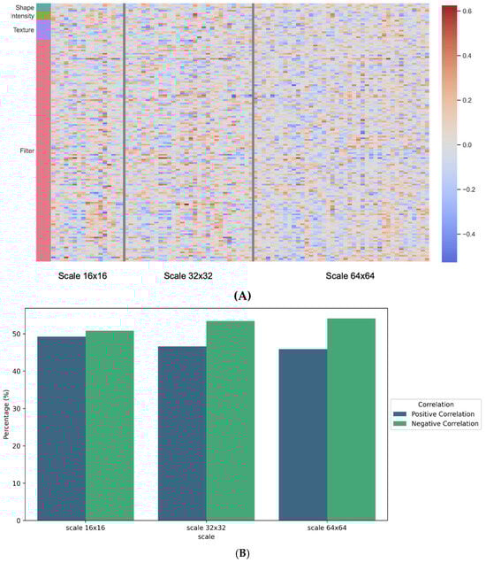 (A) Detailed correlation matrix heatmap. (A) Displaying Spearman’s Rank Correlation Coefficients between pathomics and radiomics features across multiple scales: The color gradient from red to blue represents the spectrum of positive to negative correlations, respectively, segmented by feature category (Shape, Intensity, Texture, and Filter) and spatial resolution (Scale 16 × 16, Scale 32 × 32, Scale 64 × 64). The intensity of the color indicates the strength of the correlation, providing insights into the multidimensional relationship between imaging characteristics and histopathological patterns. (B) Bar Chart illustrating the proportion of positive and negative correlations between radiomics and pathomics features at varied analytical scales: This chart quantitatively contrasts the prevalence of positive (blue) and negative (green) correlation coefficients, providing a clear visual representation of the directional relationships across distinct spatial resolutions in the dataset.