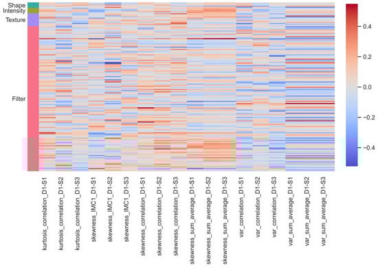 We also investigated the association of pathomics features with different groups of radiomics-based features. Figure 3 illustrates the heatmap of correlations between various groups of radiomics features and the common correlated pathomics features across all scales. In the variable naming, “S1” refers to the 16 × 16 scale, “S2” to the 32 × 32 scale, and “S3” also refers to the 64 × 64 scale. Filter-based features, as well as pathomics features like correlation, information measure of correlation 1, and sum average, were found to be significant in this association study. These findings suggest that there are meaningful relationships between textural and structural characteristics extracted from radiological and pathological data. The presence of correlations between these different types of features highlights the potential for synergistic information when combining radiomics and pathomics analyses, which can lead to a more comprehensive understanding of the underlying biological and clinical aspects of the studied NSCLC cases.