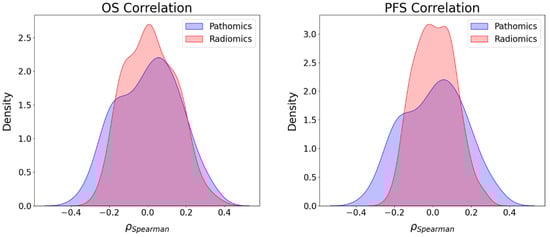 Correlation distribution between pathomics and radiomics features and survival endpoints (left—OS and right—PFS).