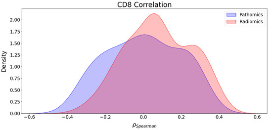 A study on the association between imaging features and CD8 endpoints was conducted. The analysis revealed that the correlation between pathomics features and CD8 ranges from −0.35 to 0.33, and in the case of radiomics features, it spans from −0.34 to 0.41, as illustrated in Figure 5. The number of positive and negative correlations between pathomics features and CD8 was the same, with 44 for each. In the case of radiomics features, 106 positive correlations were observed against 50 negative ones. To compare the two distributions, we performed the KS test. We obtained the KS statistic of 0.196 with a p-value of 0.022, suggesting that there is a statistically significant difference between the two distributions and that the two sets of imaging features exhibit a distinct association with the CD8 immune phenotype. The main variables influencing the correlations between pathomics features and clinical endpoints were identified as contrast, correlation, sum variance, sum average, and Information Measure of Correlation 1. However, the radiomics features most influencing correlations with clinical endpoints predominantly belonged to the filter-based features.