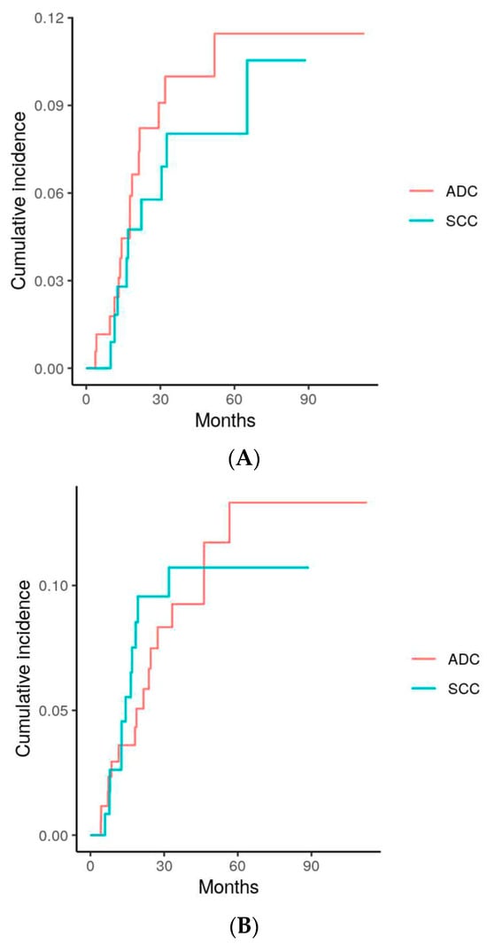 Estimates for OS and DFS were conducted using the Kaplan–Meier method, and the cumulative incidence of LF, NF, and DF was estimated using the Aalen–Johnson estimator with the patient death considered a competing risk. Statistical significance between ADC and SCC in each of the outcomes above was tested using the log-rank test. The Fine–Gray model was used for univariate analyses of the association between the histology and the outcomes. The Fine–Gray model was also used in a multivariate manner to control for possible confounding variables, which were found to be potentially associated with the histology (p < 0.1). The subdistributional hazard ratios, 95% Cls, and 3-year cumulative incidence rates were reported. Calculated p-values were two-sided with α = 0.05. Statistical analysis was conducted using R (version 4.2.0, R Project for Statistical Computing, Vienna, Austria) [].