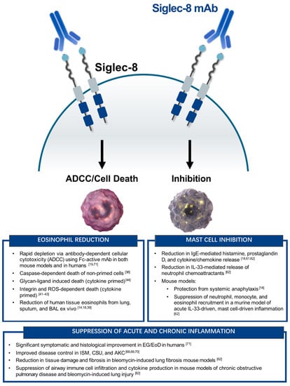 The activity of Siglec-8 mAbs in vivo was recently evaluated by several groups using transgenic and humanized mice that express functional Siglec-8. A single dose of a Siglec-8 mAb significantly reduced blood eosinophils in humanized mice with recombinant IL-5-induced eosinophilia []. To create a mouse model of eosinophilic gastroenteritis, Siglec-8 transgenic mice were given repeated intragastric injections of ovalbumin, which induced gastric and duodenal eosinophilia []. The administration of a Siglec-8 mAb with antibody-dependent cell-mediated cytotoxicity (ADCC) activity depleted blood eosinophils. In addition, Siglec-8 mAb treatment significantly reduced gastric, duodenal, and mesenteric lymph node eosinophils, as well as local and systemic inflammatory mediators, including CCL2, CCL5, and IL-9 [].
