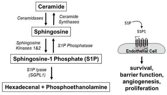 Sphingosine Metabolism. Sphingosine, produced by ceramide hydrolysis via ceramidase, is phosphorylated by sphingosine 1 kinase to generate sphingosine 1 phosphate (S1P), which promotes endothelial cell survival via S1P receptor 1 (S1P1). S1P is irreversibly degraded by S1P lyase (SGPL-1).