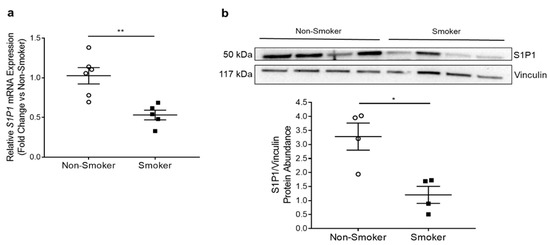 We isolated primary HLMVECs from lungs of donors using a method adapted from Comhair et al. []. We defined donors as non-smokers if they had never smoked or had a remote and minimal smoking history or as smokers if they were active smokers until their death. Demographic and brief clinical characteristics of deidentified donors whose lungs were used for indicated experiments are listed in Table S1. We quantified S1P1 mRNA expression by RTqPCR in HLMVECs isolated from six non-smokers and five smokers. We found that smokers’ HLMVECs had significantly decreased S1P1 mRNA expression (p = 0.0035) (Figure 2a). We next quantified S1P1 protein abundance by Western blotting on HLMVEC protein lysates, which also exhibited a significant decrease in S1P1 in smokers (p = 0.01) (Figure 2b). To investigate if other S1P receptors were affected, we focused on S1P receptor 2 (S1P2), whose downstream signaling may counteract the pro-survival signaling initiated by S1P1, inducing endothelial cell dysfunction and transdifferentiation, such as the upregulation of smooth muscle gene alpha-actin []. There was no significant difference in S1P2 mRNA expression between non-smokers and smokers (Figure S1a) or in ACTA-2 mRNA expression, which encodes alpha-2 smooth muscle actin (Figure S1b).