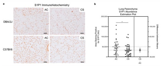 Since the study of HLMVECs was performed ex vivo on cultured cells following lung homogenization and single cell isolation, the results may not fully recapitulate in vivo phenotypes. We therefore investigated S1P1 abundance in lung parenchyma in situ following chronic smoking in mouse and human tissues. In a model of chronic exposure, DBA/2J (n = 4) or C57Bl/6 (n = 3) mice were exposed to AC or CS for 6 months. We performed immunohistochemistry for S1P1 in the mouse lung, focusing on the distal lung where LMVECs are primarily found. Consistent with the results obtained in cultured HLMVECs, alveolar parenchyma from CS-exposed mice had decreased S1P1 abundance (Figure 3a,b). We next performed immunofluorescence for S1P1, co-staining for the endothelial cell marker CD31, on human lung alveolar tissue from 11 non-smokers and 11 smokers (donor details provided in Table S1) obtained from the NJH Human Lung Tissue Consortium. We analyzed one slide per patient and five quadrants per slide, focusing primarily on the alveolar areas. We calculated the proportion of endothelial cells that were positive for both CD31 staining (green) and S1P1 staining (red). As S1P1 can be either located on the surface of the endothelial cell plasma membrane or internalized intra- cellular, we counted cells that displayed both green (CD31) and red (S1P1) staining in close proximity to each other and to a nucleus (DAPI-positive, stained in blue) (Figure S2a) [,]. There was high variability in the abundance of S1P1-expressing endothelial cells in these tissues, without appreciable differences between non-smokers and smokers (Figure S2b).