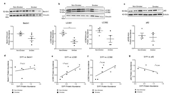 Autophagy in HLMVECs from Smokers. (a–c) Representative Western blot and densitometry analysis with vinculin (a,b) or actin (c) as loading control in non-smoker and smoker HLMVECs of (a) beclin1 abundance, 25 µg (p = 0.07); (b) LC3B1 and LC3B2, 20 µg protein per well (** p = 0.007. LC3B2 p = 0.078.); (c) p62, 20 µg protein per well (p = 0.69). All graphs (a–c) show data points, each representing an individual donor; horizontal lines are mean ± SEM. Two-tailed unpaired Student’s t-test used for statistical analysis. (d–g) Correlations between (d) S1P1 and beclin1. r2 = 0.07; p = 0.55. (e) S1P1 and LC3B1. r2 = 0.67; * p = 0.01. (f) S1P1 and LC3B2. r2 = 0.48; p = 0.06. (g) S1P1 and p62. r2 = 0.44; p = 0.22. All graphs (d–g) show data points, each representing an individual donor. Only HLMVECs which were matched by donor and passage number were included in correlation analysis. Each densitometry value was first normalized to the average control (non-smoker) densitometry obtained from its respective Western blot. Pearson’s correlation coefficients with two-tailed p-values used for statistical analyses.