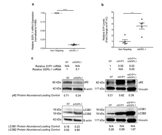 Since S1P supports HLMVEC survival, we hypothesized that increasing S1P signaling in HLMVECs promotes the completion of autophagic flux via S1P1. Exogenous S1P has a short half-life [] and S1P agonists such as FTY720 have multiple non-specific effects []. However, when generated intracellularly, S1P can be transported to exert outside-in signaling via its receptors. Thus, in order to sustainably increase S1P levels, we inhibited its degradation by the S1P lyase (an enzyme encoded by SGPL-1) (Figure 1). This method also allowed us to test the role of both outside-in and intracellular signaling of S1P. We transfected non-smoker HLMVECs with SGPL-1 siRNA (siSGPL-1), using non-targeting (NT) siRNA as the control. siSGPL-1 transfection expectedly decreased SGPL-1 mRNA expression by 90% (Figure 5a) and increased intracellular S1P levels by more than two-fold compared to the NT control, as measured by mass spectrometry (p = 0.002) (Figure 5b). HLMVECs transfected with siSGPL-1 had increased conversion of LC3B1 to LC3B2 and decreased p62 abundance compared to the NT control, consistent with the activation and completion of the autophagic flux (Figure 5c).