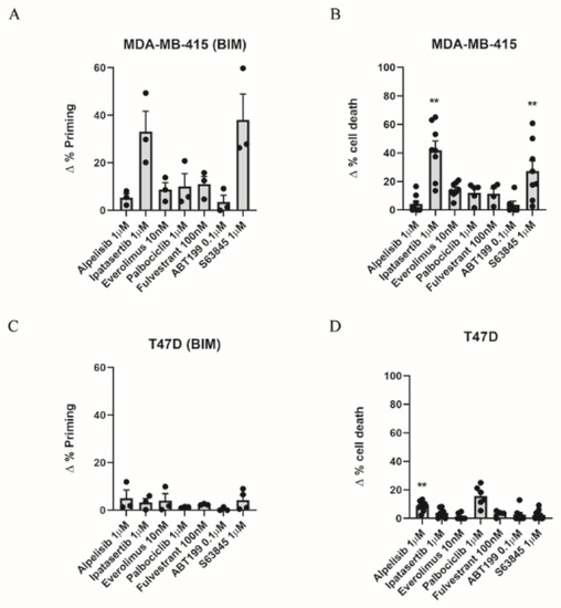 Breast cancer is the major cause of mortality in women [1]. Despite the identification of different molecular targets and the development of specific inhibitors against them [3], resistance toward these treatments leads to disease progression. Particularly in ER+ breast cancers, one-third of patients relapse and present risk of metastasis after treatment with ER-targeting agents [17]. Here, we used DBP to identify new potential treatments with BH3 mimetics for ER+ breast cancer. In fact, we used DBP to predict the efficacy of ipatasertib and S63845 in MDA-MB-415 cells which correlated with later cytotoxicity (Figure 1A,B). Despite observing cytotoxicity when treating with ipatasertib, we could not detect it with alpelisib, as it was expected due to the loss of function mutation in PTEN occurring in this cell line [59,60] (Figure 1B). Similar results have been reported before and could be linked to different regulation steps of the signaling pathway, such as the distinct levels of PIK3CA pathway activation, the AKT signaling independent of PIK3CA, the crosstalk with other pathways, and the complex feedback regulation of the pathway itself [61]. This level of complexity has been previously reported in a detailed network model that explored the resistance mechanisms to PI3K inhibitors [62]. Therefore, we postulate the possible use of an AKT inhibitor to treat ER+ breast cancer similarly to what has been reported for metastatic triple-negative breast cancer [63]. Furthermore, the high cytotoxicity showed by the BH3 mimetic S63845 reinforces the idea that one of the key anti-apoptotic proteins in breast cancer is MCL-1 [49]. In T47D cells, we observed a much lower response to all single agents tested, with the sole exception of alpelisib (Figure 1D) as these cells harbor activating PIK3CA mutation [60]. However, we could not observe cytotoxic effects of ipatasertib (Figure 1D), which can be linked to the weak phosphorylation of Akt observed in these cells despite the described activating mutation and gain of copy number of PIK3CA [64]. These results also showed the different responses to treatments that cell lines from the same cancer subtype could display. For this reason, the use of DBP could be crucial for the identification of new effective treatments for different ER+ cancer patients that are no longer responding to endocrine therapy.
