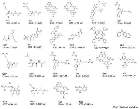 A total of 61 analogs of the inhibitors—22 of natural (N) (Figure 2-part 1) and 39 of synthetic (S) (Figure 2-part 2) origin—were collected from the PubChem database [] and other literature [,,,]. Inhibitors were screened based on their pharmacological properties (IC50 and Ki values), as shown in Figure 2. The qualitative and quantitative characterization—such as physicochemical properties—was generated using the Molinspiration web server (http://www.molinspiration.com, accessed on 16 April 2021). The absorption, distribution, and toxicity prediction are summarized in Tables S1–S3, respectively. Inhibitor optimization was carried out using Sybyl-x1.1 with a conjugate gradient method (TRIPOS Inc.1699, St. Louis, MO, USA).