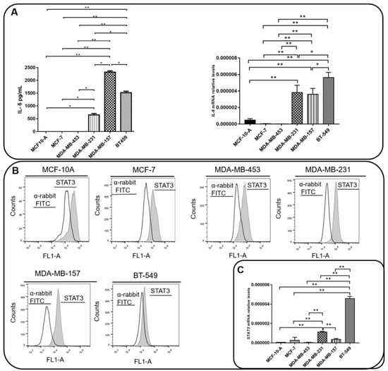 Interleukin 6 (IL-6) and STAT3 expression in BC cells. (A) IL-6 levels were measured by ELISA assay in supernatants of MCF-10, MCF-7, MDA-MB-231, BT-549, MDA-MB-157 and MDA-MB-453 cells. IL-6 mRNA relative levels of MCF-10, MCF-7, MDA-MB-231, BT-549, MDA-MB-157 and MDA-MB-453 cells were also recorded. (B) Expression of activated STAT3 (STAT3pY705) in MCF-10, MCF-7, MDA-MB-231, BT-549, MDA-MB-157 and MDA-MB-453 cells was analyzed by flow cytometry (gray peak). As the negative control, the secondary antibody alone was used (white peak). (C) STAT3 mRNA relative levels of MCF-10, MCF-7, MDA-MB-231, BT-549, MDA-MB-157 and MDA-MB-453 cells. (D) STAT3 phosphorylation levels (STAT3pY705-dark gray peak with tracing line) were analyzed in MDA-MB-231 and MDA-MB-157 cells treated with Tocilizumab (TCZ), recombinant IL-6 (rIL-6) and STAT3 inhibitor, STATTIC (STC). As the negative control, the secondary antibody alone was used (white peak). * p < 0.05; ** p < 0.001. Three independent experiments were performed.