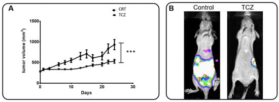 Female athymic nude mice (2–4 months old) were subcutaneously inoculated with 1 × 106 MDA-MB-231-Luc cells. After tumors reached 300 mm3, animals were randomized into two groups. The treatments were carried out intraperitoneally with PBS + DMSO 5% (group control, n = 11) or with TCZ 10 mg/kg (n = 7) three times a week for 1 month or if tumors reached 1000 mm3. After treatments, tumors were resected, and metastases were monitored in vivo by whole animal imaging with bioluminescence (IN-VIVO FX Pro, Bruker, Billerica, MA, USA).