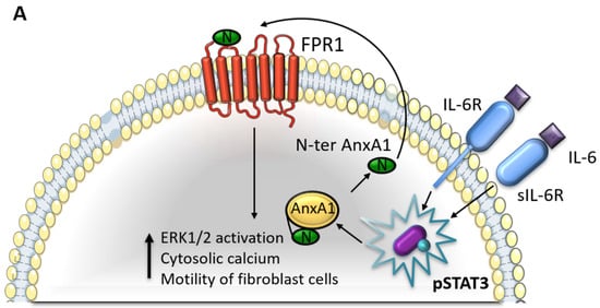 In the last decade, researchers have focused on the correlation between AnxA1 and the aggressiveness of different tumors [18,19,20,21]. In BC context, higher expression levels of AnxA1 have been described for the TNBC subtype [22,23] and the role of this protein in inducing the epithelial-mesenchymal transition (EMT) in BC has also been depicted [24]. AnxA1 can be found in cytoplasm, nuclei and supernatants of the TNBC cell line, MDA-MB231, in its 37 kDa intact form and in its cleaved form of 33 kDa [23]. Notably, findings showed that the intact form displays anti-inflammatory activity while its cleaved form seems to be pro-inflammatory [25]. Interestingly, previous works showed an association between AnxA1 and the inflammatory cytokine, IL-6. On one side, it has been demonstrated that IL-6 stimulates the upregulation and secretion of AnxA1 by acting on an IL-6 responsive region within the AnxA1 promoter [26]. On the other side, it has been demonstrated that AnxA1 signaling through FPR2 inhibits the IL-6 expression in neutrophils [27] and that AnxA1 signaling through FPR1 inhibits the IL-6 expression in the TNBC cell line MDA-MB-231 [23].