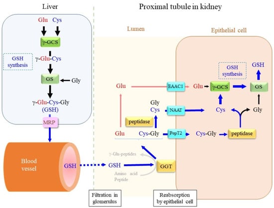 Glutathione dynamics in vivo. In the liver, glutathione is synthesized from the constituent amino acids Glu, Cys, and Gly by means of the sequential reactions of γ-GCS and GS under normal physiological conditions. The resultant glutathione is largely released into the bloodstream from cells via the multidrug resistance-associated protein (MRP) family. At the renal glomerulus, GSH as well as other nutrients are filtered mostly into the primary urine. The tubular epithelium is rich in GGT, which degrades glutathione. The γ-glutamyl moiety is removed by GGT, and the remaining Cys-Gly is either transported into cells directly via dipeptide transporter PepT2 or further hydrolyzed to Cys and Gly by dipeptidase, and then, transported via the neutral amino acid transporter NAAT. The γ-glutamyl moiety of glutathione is converted to free Glu, which is transported via EAAC1. Incorporated amino acids or dipeptides could contribute to glutathione synthesis. The production of new γ-glutamyl peptides by GGT is unlikely, however, because the extracellular contents of amino acids are limited to serving as substrates for the γ-glutamylation reaction.