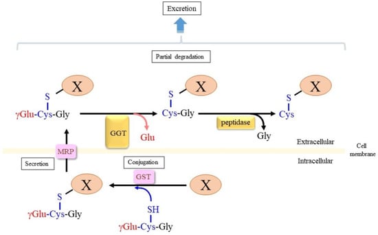 Glutathione conjugation of xenobiotic compounds and their metabolic conversion in the extracellular space. Xenobiotic compounds (X) experience metabolic detoxification mostly in the liver. Glutathione conjugation is one of three popular conjugation reactions that stimulate the secretion of conjugated compounds from the cell via MRP. GGT localized on the cell surface then removes the γ-glutamyl moiety, and then, the Gly unit can also be removed by extracellular dipeptidases. As a result, only the Cys portion of glutathione remains bound to a xenobiotic compound.