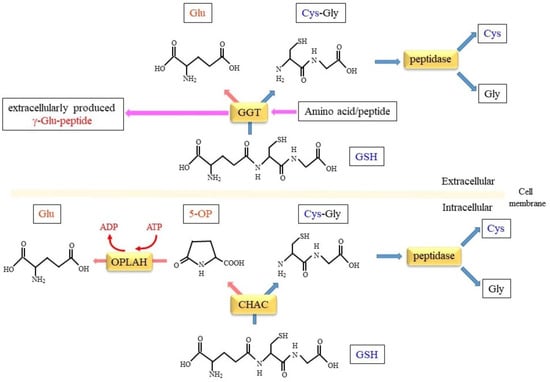 Glutathione degradation inside cells is initiated by isozymes of γ-glutamylcyclotransferase (Figure 3). Initial studies have shown that γ-glutamylcyclotransferase liberates the γ-glutamyl moiety from γ-glutamyl amino acids, excluding GSH, as 5-OP []. While such activity has been recognized for a long time, the protein that exhibits glutathione-specific γ-glutamylcyclotransferase activity was only recently identified. The first identified enzyme was cation transport regulator protein 1 (CHAC1), which was originally reported as a proapoptotic component []. The CHAC family proteins consist of CHAC1 and CHAC2, and their genes are located on human chromosomes 15 and 2, respectively. CHAC specifically acts on GSH with a Km of 0.1–2 mM, which is the appropriate value for the degradation of GSH inside cells [,]. However, CHAC 1 shows activity that is approximately 20 times higher than that of CHAC 2.