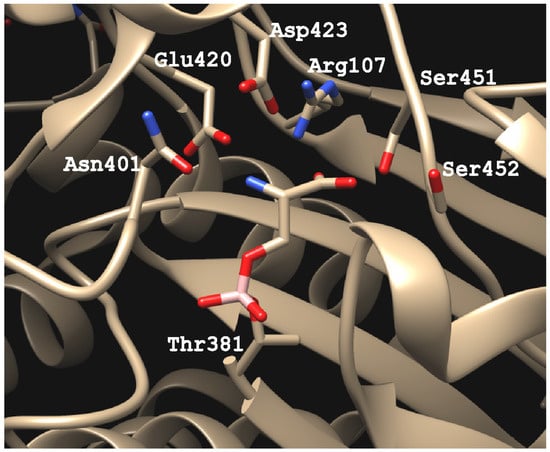 A γ-glutamyl group of the substrates is recognized by several residues of the active site in human GGT (Figure 6). The α-amino group of the γ-glutamyl moiety interacts with the carboxyl groups of Glu-420 and aspartate (Asp)-423 and with the amide carbonyl group of asparagine (Asn)-401 via electrostatic and hydrogen bonding. On the other hand, the α-carboxyl group interacts with the guanidino group of arginine (Arg)-107 and with the hydroxy group of Ser-451. The carboxy group of the substrate also forms hydrogen bonds with the peptide nitrogen of Ser-452 and possibly its side chain hydroxy group. These interactions allow the enzyme to specifically recognize the γ-glutamyl group. Because GGT tolerates the D-stereoisomer of the γ-glutamyl group as the donor, ionic bonds may be more significant than hydrogen bonds due to their nondirectional characteristic.