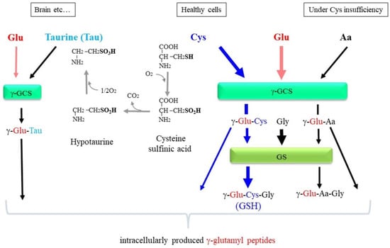 - Fujii, J.; Osaki, T.; Soma, Y.; Matsuda, Y. Critical Roles of the Cysteine-Glutathione Axis in the Production of γ-Glutamyl Peptides in the Nervous System. Int. J. Mol. Sci. 2023, 24, 8044. [Google Scholar] [CrossRef]