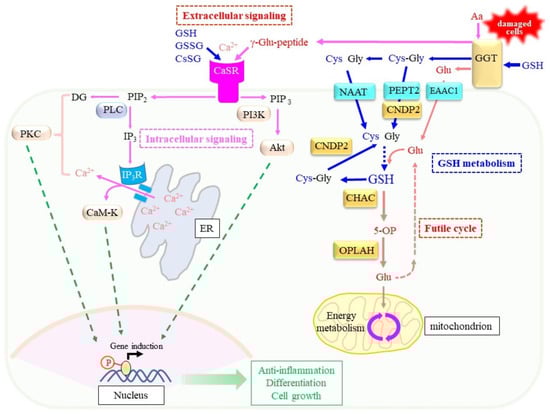 Glutathione is a pivotal molecule that protects cells from the cytotoxic effects of xenobiotic compounds via conjugation reactions and oxidative insults through the reductive detoxification of peroxides by donating electrons to the redox system. The degradation of glutathione by GGT recruits amino acids, notably Cys, to cells, but also produces γ-glutamyl peptides extracellularly under certain circumstances. γ-Glutamyl peptides are also produced intracellularly by γ-GCS-mediated reactions. These reactions appear to proceed under pathological conditions and act as a cellular defense. Although the significance of extracellularly produced γ-glutamyl peptides by GGT have long been obscured, the discovery that γ-glutamyl peptides modulate CaSR function has unveiled their potential roles in extracellular signaling. At present, the signaling role of γ-glutamyl peptides is known to be primarily manifested in the gastrointestinal tract and in the nervous system, but the systemic expression of CaSR may extend this phenomenon to other physiological functions, such as those in the cardiovascular and immune systems.