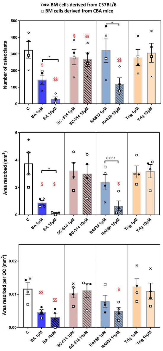 To explore the interaction between the effects of SFX-01 and direct NF-KB pathway modulation, the effects of BA (10 μΜ) were examined with and without SFX-01 (2.5 μΜ) supplementation only for the initial 24 h (ES). The treatment of mouse cells consistently indicated that BA more efficiently targets area resorbed/osteoclast than it does osteoclastogenesis compared with SFX-01. Treatment with SC-514 failed to exert statistical differences in osteoclast behaviour; albeit using a relatively small sample size.