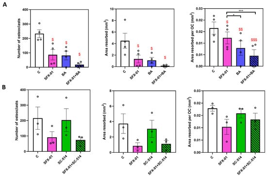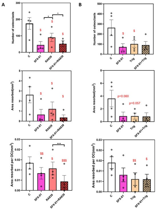 As early osteoclast differentiation accommodates vital osteoclast precursor multinucleation, the effects of early exposure to SFX-01 were additionally explored through DAPI staining to assess the levels of multinucleation. These studies indicated that the addition of SFX-01 at the ES generated cells with smaller overall size containing fewer nuclei compared to the controls (treated with M-CSF and RANKL; Figure 3B).