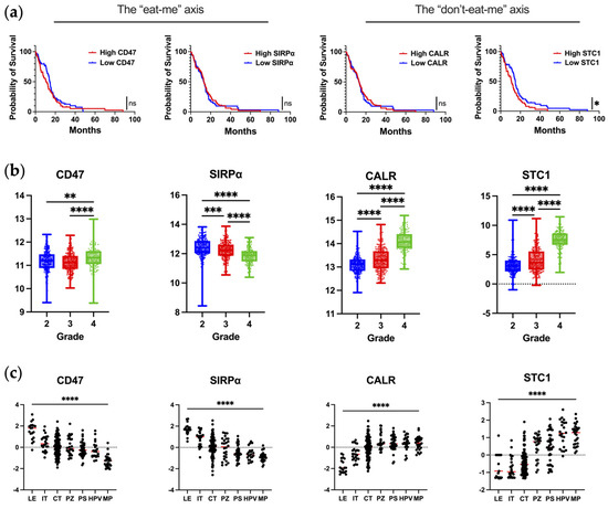 The expression of key molecules regulating phagocytosis in human glioblastoma. (a) Correlation of mRNA expression with overall survival in newly diagnosed IDHwt glioblastoma patients as analyzed from TCGA database using Gliovis. Kaplan–Meier curve is calculated based on high versus low expression of markers dichotomized based on the median expression in glioma patients. CD47: n = 142; median survival for high–CD47 (n = 70) and low–CD47 (n = 72) are 11.0 and 14.5 months, respectively (p = 0.24). SIRPα: n = 145; median survival for high–SIRPα (n = 74) and low–SIRPα (n = 71) are 13.3 and 13.0 months, respectively (p = 0.82). CALR: n = 142; median survival for high–CALR (n = 71) and low–CALR (n = 71) are 13.1 and 13.0 months, respectively (p = 0.88). STC1: n = 142; median survival for high–STC1 (n = 70) and low–STC1 (n = 72) are 10.8 and 14.9 months, respectively (p = 0.03). Mantel–Cox test was used to compare groups: ns denotes p > 0.05, * denotes p ≤ 0.05. (b) Expression of markers at the mRNA level as a function of glioma grade as analyzed from TCGA database using Gliovis. Ordinary one–way ANOVA with Tukey’s multiple comparison test was used to compare each grade: * denotes p ≤ 0.05, ** denotes p ≤ 0.01, *** denotes p ≤ 0.001, **** denotes p ≤ 0.0001. (c) Expression of markers based on anatomical location as analyzed from the Ivy Atlas using Gliovis. Ordinary one–way ANOVA with Tukey’s multiple comparison test was used to compare locations: **** denotes p ≤ 0.0001. LE, leading edge; IT, infiltrating tumor; CT, cellular tumor; PZ, perinecrotic zone; PS, pseudopalisading cells around necrosis; HPV, hyperplastic blood vessels in cellular tumor; MP, microvascular proliferation. The markers are annotated with the axes they are part of, respectively.