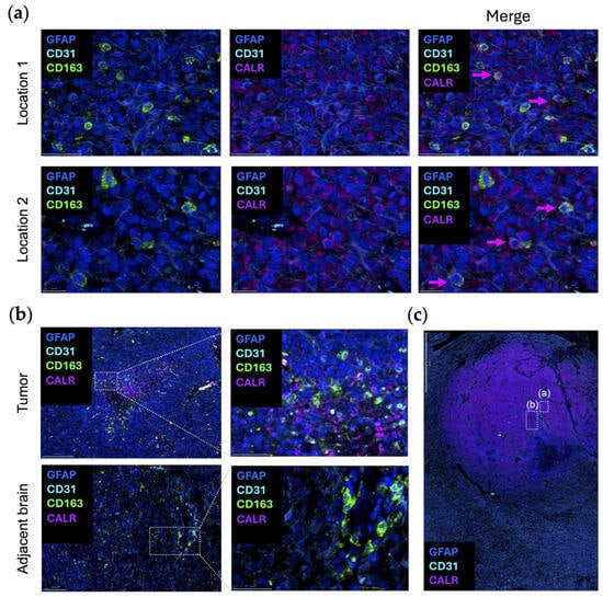 Original representative images of the spatial localization of CALR/STC1 expression. (a) Representative images showing the colocalization of CALR (purple; Abcam, clone FMC75, dilution 1/1000) and CD163 (green; Abcam, clone EPR19518, dilution 1/600) within the same cell. Multiple regions were analyzed and show concordant expression of both CD163 (green) and CALR (purple). Location 2 is highlighted in panel (c) with boxed window “(a)”. Scale bar = 50 µm (location 1) and 20 µm (location 2). (b) CALR (purple) colocalized with CD163 (green) in the perinecrotic zone within the glioblastoma (top panels). This area is highlighted in panel (c) within boxed window “(b)”. In the region of the adjacent brain, CD163 (green) expression is present in the blood vessels, but CALR (purple) is absent (bottom panels). Panels on the right are magnified views of the highlighted area on the left. Scale bar = 200 µm (top left), 50 µm (top right), 100 µm (bottom left), and 50 µm (bottom right). (c) Newly diagnosed glioblastoma sample with adjacent peritumoral brain (lobectomy resections, n = 2) analyzed using automated sequential multiplex immunofluorescence as previously described [,,]. CALR (purple) is expressed throughout the tumor region. Area shown in boxed window “(a)” is location 2 of panel (a). Area shown in boxed window “(b)” is tumor in panel (b). Scale bar = 2 mm. Nuclei are denoted with DAPI (dark blue; ThermoFisher Scientific); glioblastoma tumor cells and astrocytes are marked with GFAP (light blue; Sigma, clone GA5, dilution 1/2000); vasculature is marked with CD31 (cyan blue; Abcam, clone EPR17259, dilution 1/1500); macrophages are marked with CD163 (green).