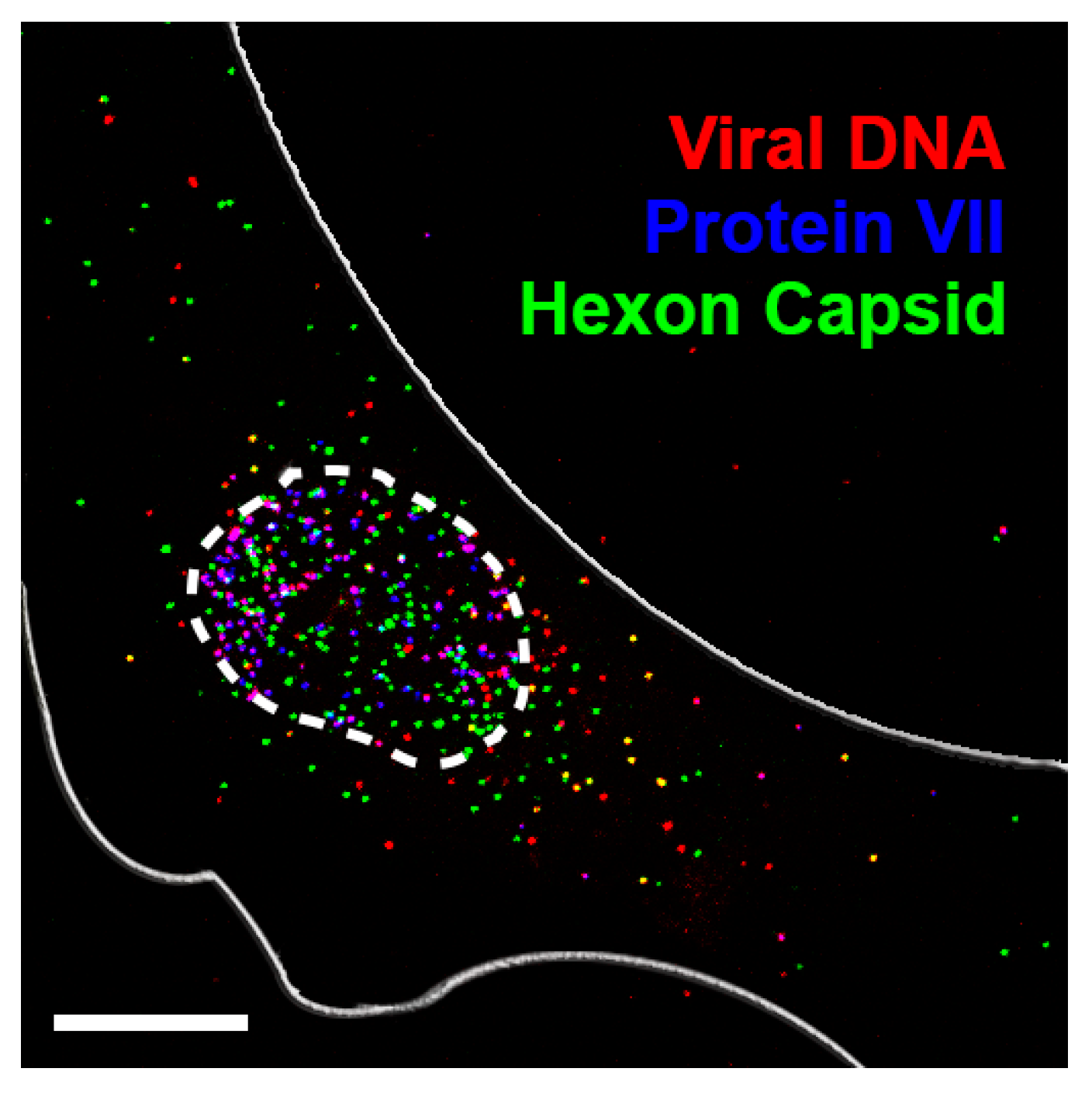 Misdelivery of capsid-free adenovirus DNA after uncoating at the nuclear pore complex. Wang et al. [53] infected HeLa cells for 150 minutes followed by fixation and viral genome click-labeling using Alexa Fluor 594 (red). Shown is a total projection of confocal optical slices depicting immune-stained protein VII (blue) and hexon capsid (green). Viral genomes associated with protein VII appear as purple dots in the nucleus, whereas partially uncoated cytosolic virus particles containing viral DNA (vDNA) appear as yellow dots. It is thought that protein VII remains attached to incoming vDNA during translocation into the nucleus, but copy number per genome is uncertain, as well as if any other viral proteins, such as terminal protein or protein X remain associated during import [58,59,60]. Analyses revealed that a large pool of viral DNA does not reach the nucleus during infection, but rather accumulates capsid-free in the cytosol of the host cell. The borders (white) were identified using DAPI for the nucleus and contrast-enhanced protein VII for the cell membrane. Scale bar, 10 µm.