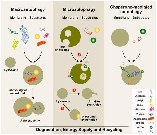 The term autophagy summarizes the processes involved in the orderly degradation and recycling of worn, abnormal, or malfunctional cellular components. It is commonly accepted today that the term “autophagy” was first introduced in 1963 by the Belgian cytologist and biochemistry Christian René de Duve, who also coined the terms “endocytosis” and “phagocytosis” to designate pathways bringing substrates for digestion in lysosomes []. However, the terms autophagy/autophagy/autophagia were in fact already used a century earlier and published in 1859 in a French journal []. The importance of autophagy was prominently acknowledged in 2016, when Yoshinori Ohsumi was awarded the Nobel Prize for Physiology or Medicine for his discoveries of mechanisms for autophagy. Autophagy is nowadays considered as a dynamic recycling system, which is essential for cellular renovation and homeostasis []. As such, the resultant degradation products can be used for new protein synthesis, energy production, and gluconeogenesis. There are three classes of autophagy, namely macroautophagy, microautophagy, and chaperone-mediated autophagy, requiring different sets of autophagy-related genes and cellular compounds [] (Figure 1). Macroautophagy is the most prevalent form of autophagy. It is dependent on the “autophagosome”, a spherical vesicle appearing randomly throughout the cytoplasm with the capacity to traffic along microtubules towards the microtubule-organizing center, where lysosomes are concentrated []. These ring-shaped structures are majorly formed by the “AuTophaGy” (ATGs) genes that are evolutionarily conserved from yeast to higher eukaryotes. This cellular compartment has the capacity to sequester small portions of cytoplasm enriched in soluble materials and organelles and to fuse with lysosomes forming the autolysosome, in which the material is finally degraded. On the contrary, microautophagy is a more diverse type of autophagy, in which cytoplasmic compounds or spontaneous formed vesicles are directly engulfed by lysosomes. Recent studies demonstrate that this pathway is of particular relevance for cells under amino acid starvation []. Based on the finding that vascular membranes and endosomes can also incorporate or capture peroxisomes or lysosome-derived organelles, it was proposed that this autophagy branch should be classified in three distinct subtypes of microautophagy []. Chaperone-mediated autophagy is more selective and not associated with membrane reorganization []. Instead, chaperone and co-chaperone proteins recognize cytosolic proteins that carry specific peptide recognition sites and are then targeted to receptors on lysosomes, which subsequently internalize these proteins for degradation (Figure 1). This pathway majorly contributes to the maintenance of cellular homeostasis by facilitating degrading of proteins and recycling of amino acids. However, transgenic mouse models have shown that this pathway participates in the regulation of glucose and lipid metabolism, DNA repair, cellular reprogramming, and cellular response to stress [].