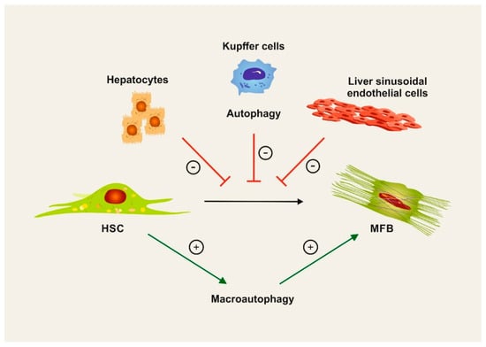 The liver responds to chronic tissue injury by organ scarring, termed fibrosis, which may result in end-stage cirrhosis []. Liver fibrosis is characterized by concerted actions of non-parenchymal cells of the liver, particularly hepatic stellate cells, macrophages (including Kupffer cells), and endothelial cells []. Autophagy appears to be critically involved in the development of liver fibrosis, but has very different, opposing functions in specific cell types [] (Figure 2).