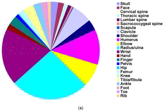 The anatomic location of the fracture was known in 101,174 of the patients (Table 2, Figure 2a,b). The upper extremity was involved in 80,973 (80.0%), the pelvis/lower extremity in 11,794 (11.7%), the spine in 3060 (3.0%), the skull/face in 4321 (4.4%), and rib/sternum in 940 (0.9%). The humerus, elbow, radius/ulna, and wrist accounted for 62.4% of all the fractures. The average age in years for these groups was 10.0 for the upper extremity, 11.7 for the lower extremity, 12.9 for the spine, 9.9 for the skull/face, and 11.3 for the rib/sternum group (p < 10−4) (Supplemental Table S1). The fracture was open in 1142 [668–1933] (1.1%) of the cases.