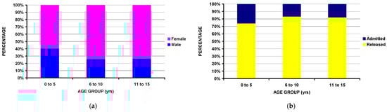 There were significant differences between the three age groups (Table 6). The youngest age group (0- to 5-year-olds) had more boys (p < 10−4) (Figure 6a) and was more likely to be admitted to the hospital (p = 0.029) (Figure 6). The oldest age group (11- to 15-year-olds) had the greatest prevalence of being bucked/thrown/kicked off the horse (p = 0.031) (Figure 6c) and the highest prevalence of lower extremity fractures (p < 10−4) (Figure 6d). Interestingly, those seen in the smallest hospitals were in the youngest age group (p = 0.0003) (Figure 6e).