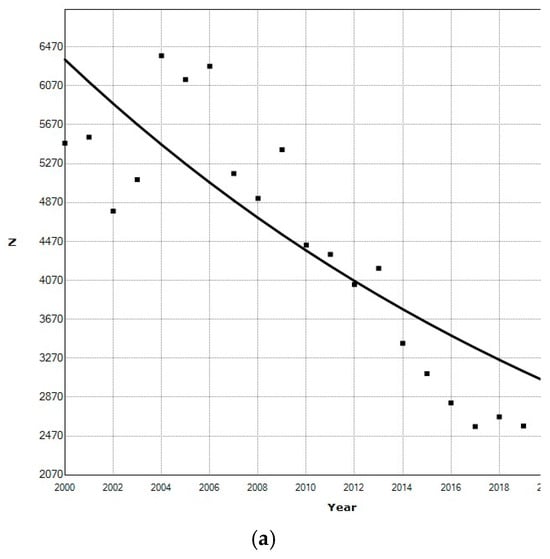 Due to the stratified and weighted nature of the NEISS data, statistical analyses must account for such a design [14]. SUDAAN 11.0.01™ software (RTI International, Research Triangle Park, NC, USA, 2013) was therefore used. The estimated number of injuries/ED visits is calculated, along with 95% confidence intervals [CIs] of the estimate. These methods are well described [14,15]. When the actual number of patients (n) is <20, the estimated number (N) becomes unstable and should be interpreted with caution; thus, we report both the n and N [15,16]. Continuous data are expressed as the mean and categorical data as frequencies and percentages. Differences between continuous variables were determined using the t-test or ANOVA. Differences between categorical variables were determined with the χ2 test. Differences over time (years) were analyzed with join point regression analysis (Joinpoint Regression Program, Version 4.8.0.1, April 2020; Statistical Research and Applications Branch, National Cancer Institute [https://surveillance.cancer.gov/joinpoint/, accessed on 4 April 2020]).
