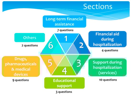 After these meetings, and with all the contributions received, the final survey included six sections: (1) long-term financial assistance, (2) financial aid during hospitalization, (3) support during hospitalization (services), (4) educational support, (5) drugs, pharmaceuticals and medical devices, and (6) others (Figure 1).