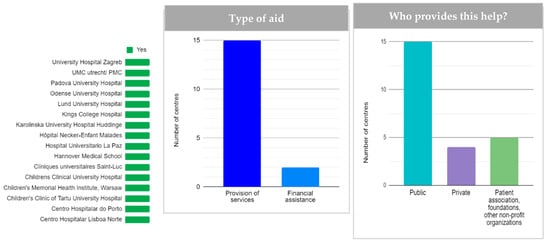 Economic aid for professional treatments (physiotherapy, speech therapy, early stimulation, psychological support, etc.). From left to right, availability, type of aid, and provider of these aids (n = 15).