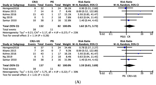 Subgroup analyses of the estimated risk ratios. PIS = pinning in situ, CR(I) = pinning following intentional closed reduction, CR(I+UI) = pinning following intentional + unintentional closed reduction, OR = open reduction, SCO = subcapital osteotomy via anterior/anterolateral hip approach. (A) Estimated risk ratio in CR(I) and CR(I+UI) versus PIS. (B) Estimated risk ratio in PIS versus OR (Parsch method). (C) Estimated risk ratio in PIS versus OR (subcapital osteotomy (SCO)). (D) Estimated risk ratio in PIS versus OR (modified Dunn). (E) Estimated risk ratio in CR(I) and CR(I+UI) versus OR (Parsch). (F) Estimated risk ratio in CR(I) and CR(I+UI) versus OR (SCO). (G) Estimated risk ratio in CR(I) versus OR (modified Dunn).