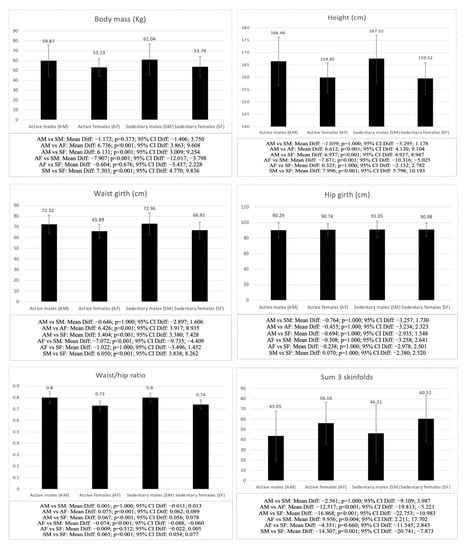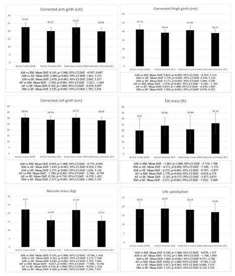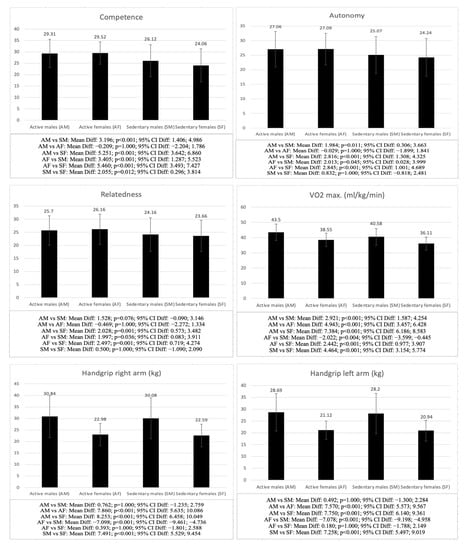 When comparing males and females with a similar level of physical activity (SM vs. SF and AM vs. AF), significant differences were observed in both active and inactive groups in all the variables analyzed, except for hip girth (SM vs. SF: p = 1.000; AM vs. AF: p = 1.000), autonomy (SM vs. SF: p = 1.000; AM vs. AF: p = 1.000), relatedness (SM vs. SF: p = 1.000; AM vs. AF: p = 1.000), AMD (SM vs. SF: p = 1.000; AM vs. AF: p = 1.000), and BMI (SM vs. SF: p = 1.000; AM vs. AF: p = 0.962), as well as life satisfaction (AM vs. AF: p = 1.000) and competence (AM vs. AF: p = 1.000) in the groups of active adolescents, in which no significant differences were found. The males in both groups showed higher scores in the anthropometric (SM vs. SF: p < 0.001; AM vs. AF: p < 0.001), psychological (SM vs. SF: competence p = 0.012, life satisfaction p = 0.021), and physical fitness (SM vs. SF: p < 0.001; AM vs. AF: p < 0.001) values, except for the sum of 3 skinfolds (SM vs. SF: p < 0.001; AM vs. AF: p < 0.001), fat mass (SM vs. SF: p < 0.001; AM vs. AF: p = 0.002) and sit-and-reach test (SM vs. SF: p < 0.001; AM vs. AF: p < 0.001), for which the females showed higher values.