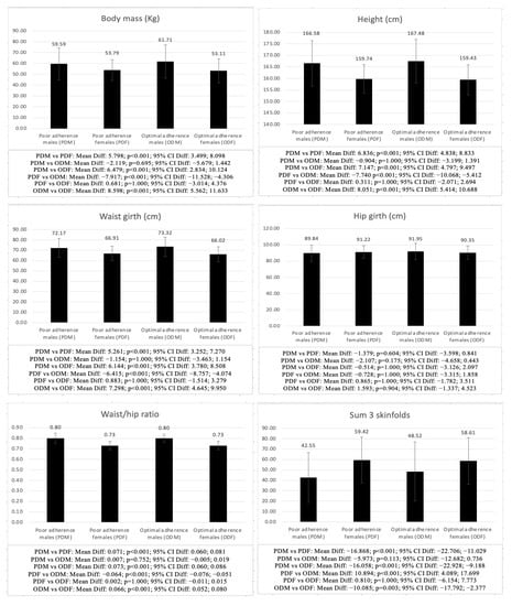To clarify the statistical analysis, the adolescents were classified according to their level of physical activity, AMD, and weight status. Thus, the classification of males and females according to their level of physical activity was active males (AM), active females (AF), sedentary males (SM), and sedentary females (SF). Regarding AMD, the classification was poor adherence males (PDM), poor adherence females (PDF), optimal adherence males (ODM), and optimal adherence females (ODF). According to weight status, the classification was normal-weight males (NWM), normal-weight females (NWF), overweight/obese males (OWM), and overweight/obese females (OWF). It should be noted that in the AMD groups, adolescents with a poor AMD and need to improve AMD were pooled so that the sample size of this group would be similar when compared with optimal AMD, as with the weight status group in which overweight and obese adolescents were pooled so that the sample size would be as that of normal weight.
