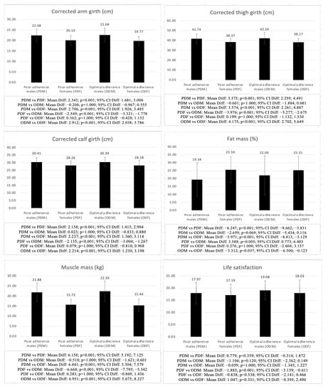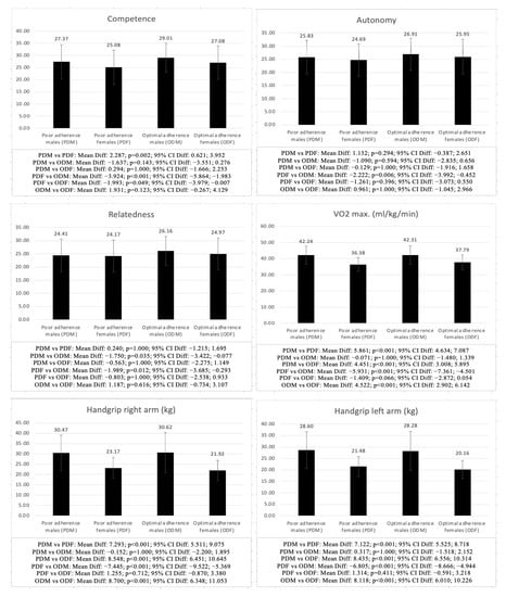 Significant differences were also found when comparing males and females with the same AMD (PDM vs. PDF and ODM vs. ODF), finding significant differences in all the analyzed variables, except for hip girth (PDM vs. PDF: p = 0.604; ODM vs. ODF: p = 0.904), life satisfaction (PDM vs. PDF: p = 0.359; ODM vs. ODF: p = 0.331), autonomy (PDM vs. PDF: p = 0.294; ODM vs. ODF: p = 1.000), relatedness (PDM vs. PDF: p = 1.000; ODM vs. ODF: p = 0.616), and BMI (PDM vs. PDF: p = 1.000; ODM vs. ODF: p = 0.125), as well as competence in the optimal AMD group (ODM vs. ODF: p = 0.123), with males in both the poor and optimal AMD groups showing higher scores in all the variables analyzed, except for the sum of 3 skinfolds (p < 0.001–0.003), fat mass (p < 0.001–0.037) and sit-and-reach test (p < 0.001), in which females showed higher scores.